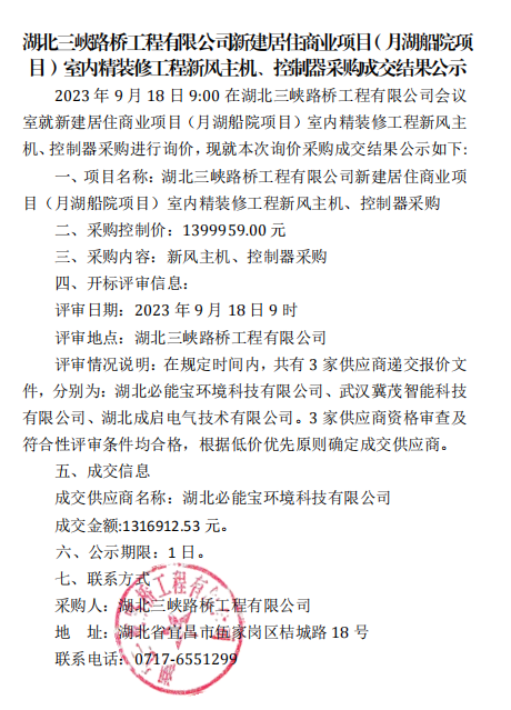 新建居住、商业项目(月湖船院项目)室内精装修工程新风主机、控制器采购成交结果公示