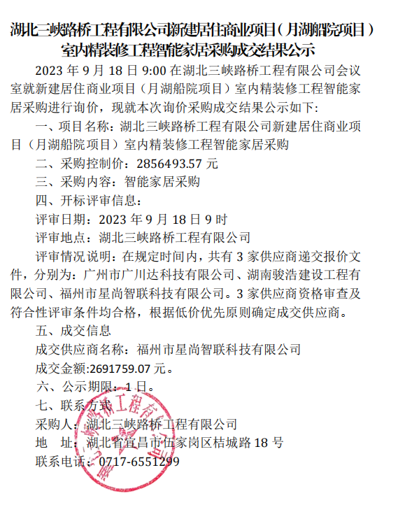 新建居住、商业项目(月湖船院项目)室内精装修工程智能家居采购成交结果公示