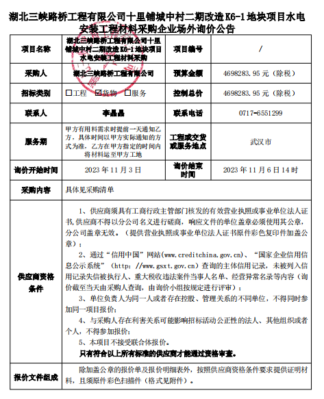 十里铺城中村二期改造K6-1地块项目水电安装工程材料采购企业场外询价公告