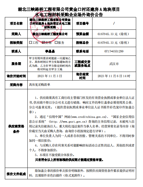 黄金口村还建房A地块项目水电工程材料采购企业场外询价公告