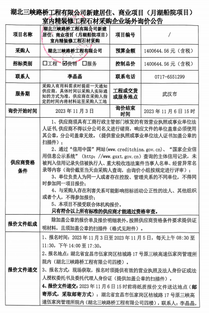 新建居住、商业项目(月湖船院项目)室内精装修工程石材采购企业场外询价公告
