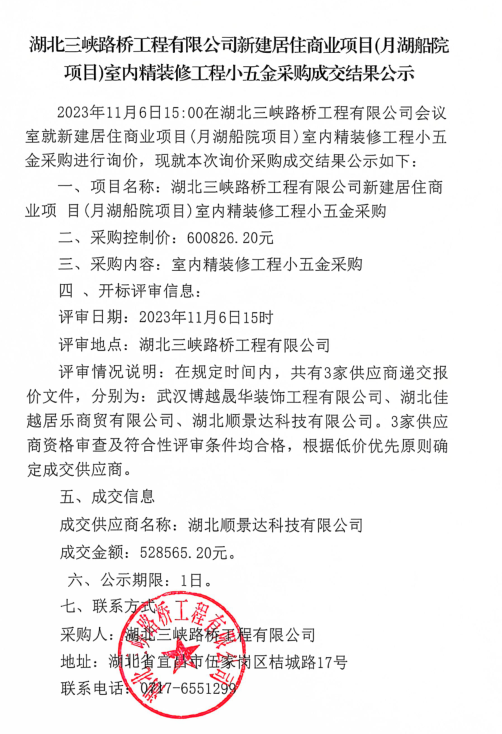新建居住、商业项目(月湖船院项目)室内精装修工程小五金采购成交结果公示