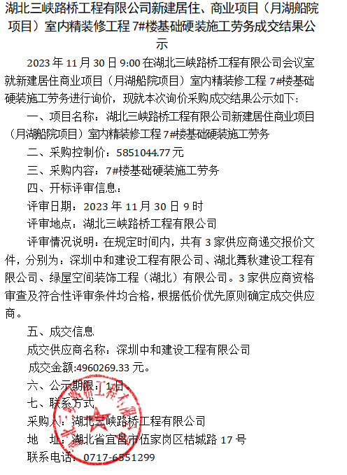 新建居住、商业项目(月湖船院项目)室内精装修工程7#楼基础硬装施工劳务成交结果公示