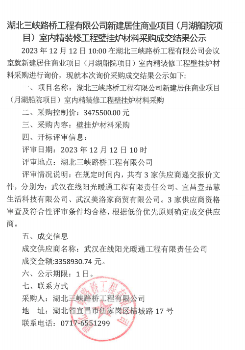 新建居住、商业项目(月湖船院项目)室内精装修工程壁挂炉材料采购成交结果公示