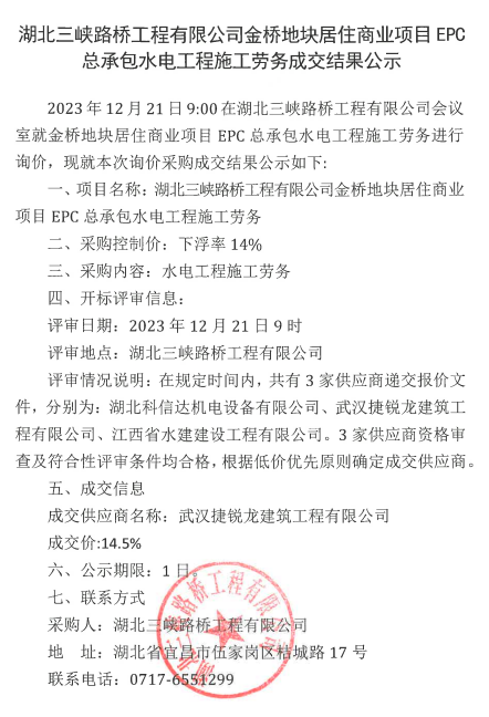 金桥地块居住商业项目EPC总承包水电工程施工劳务成交结果公示