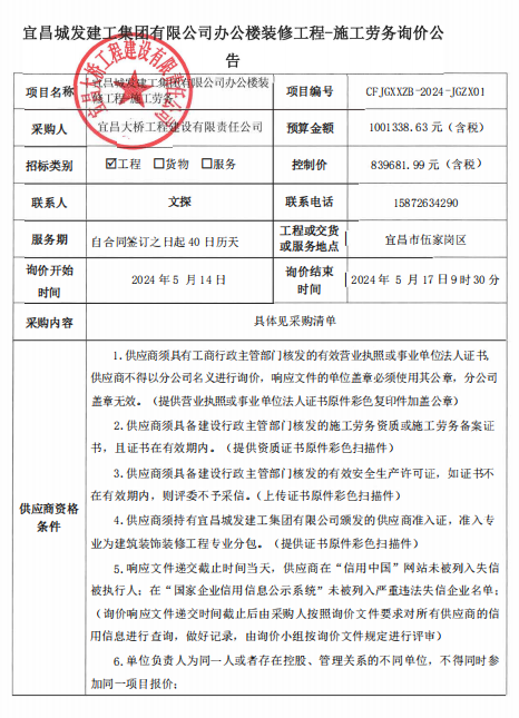 宜昌城发建工集团有限公司办公楼装修工程-施工劳务询价公告