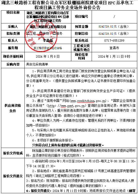 点军区联棚福利院建设项目EPC总承包工程项目施工劳务企业场外询价公告