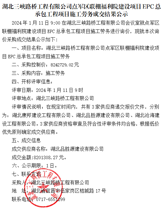 点军区联棚福利院建设项目EPC总承包工程项目施工劳务成交结果公示