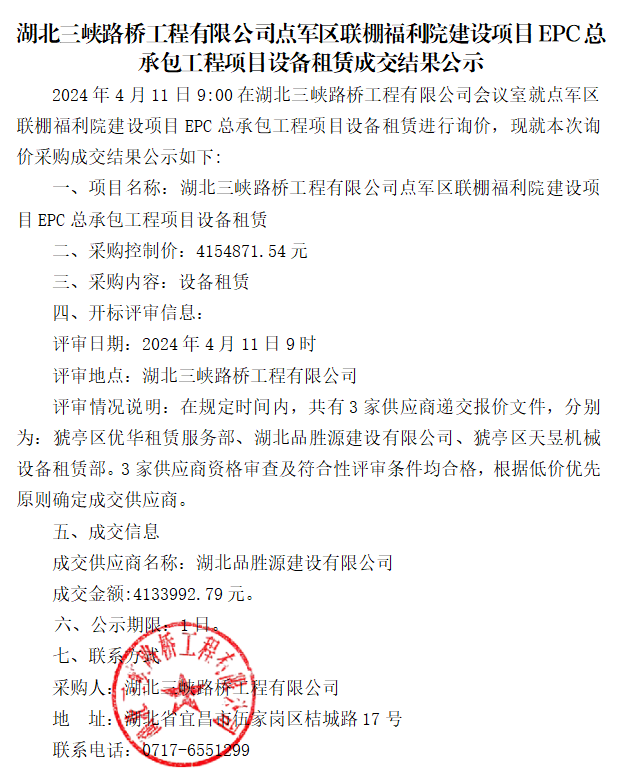 点军区联棚福利院建设项目EPC总承包工程项目设备租赁成交结果公示