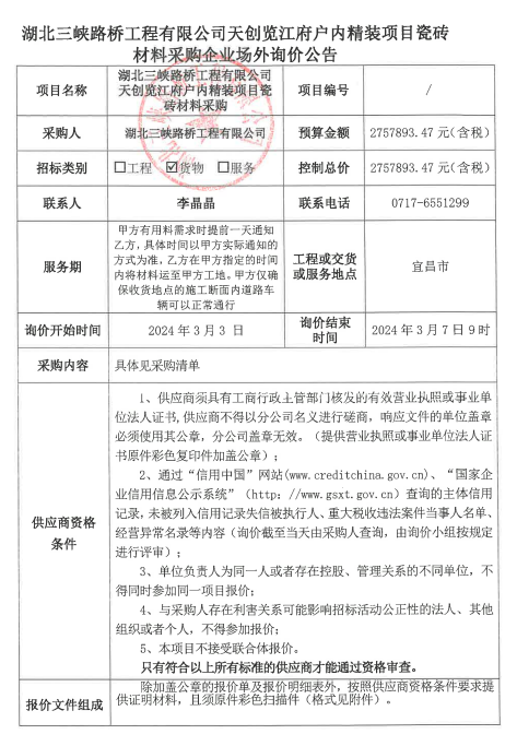 天创览江府户内精装项目瓷砖材料采购企业场外询价公告