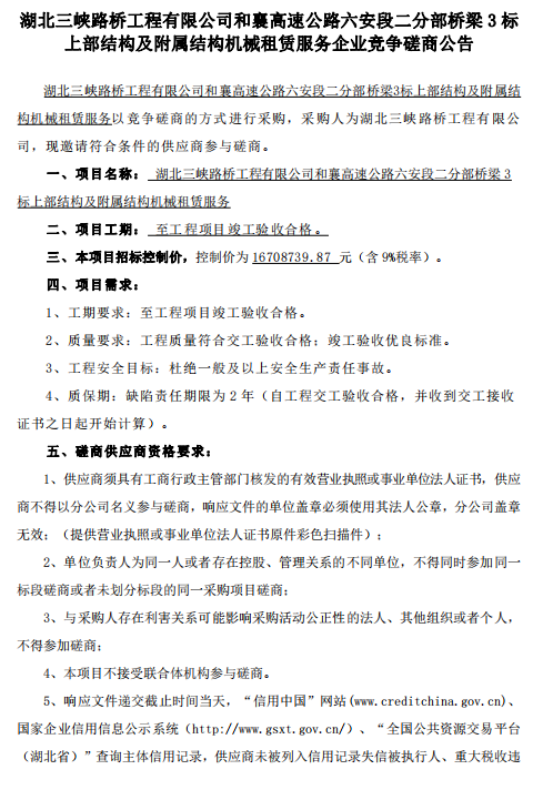和襄高速公路六安段二分部桥梁3标上部结构及附属结构机械租赁服务企业竞争磋商公告