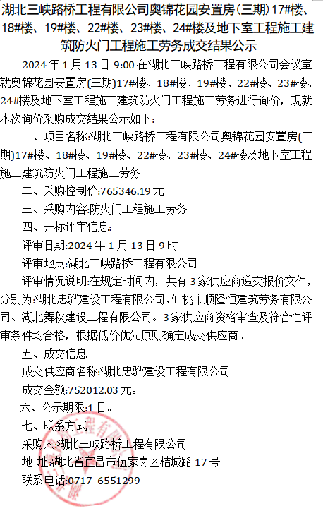奥锦花园安置房(三期)17#楼、18#楼、19#楼、22#楼、23#楼、24#楼及地下室工程施工建筑防火门工程施工劳务成交结果公示