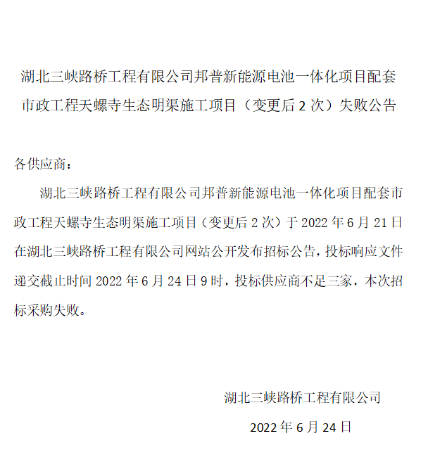 邦普新能源电池一体化项目配套市政工程天螺寺生态明渠施工项目(变更后2次)失败公告